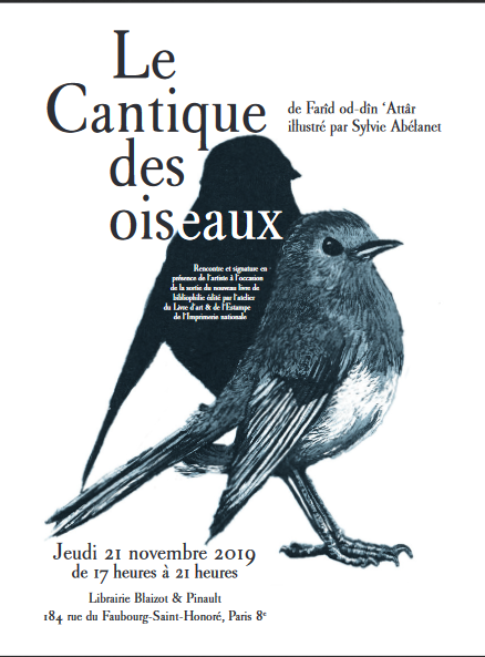 Présentation de "la Quête des oiseaux" en deux suites gravées de Sylvie Abelanet, travail de trois ans réalisé à partir du Cantique des oiseaux, poème perse de Farid od-dîn' attâr, auteur du XIIe siècle. Exposition...