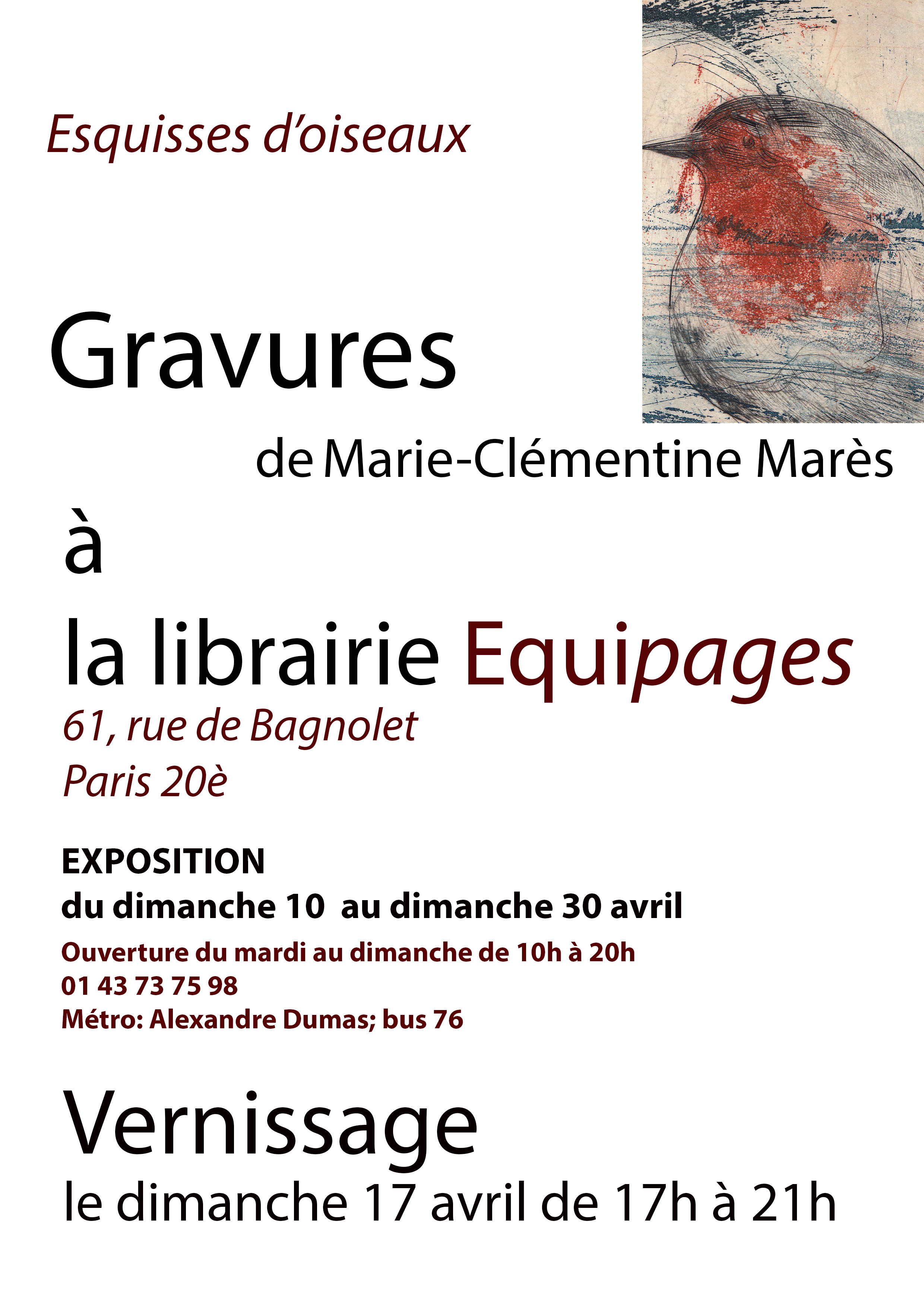 Esquisses d'oiseaux est une exposition de gravures autour de plusieurs variations: d'une plume, d'un nid et d'un oiseau. Exposants Marie-Clémentine Marès