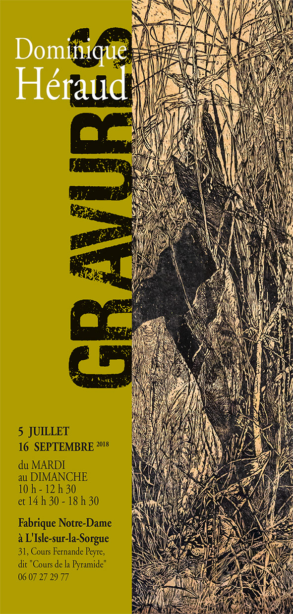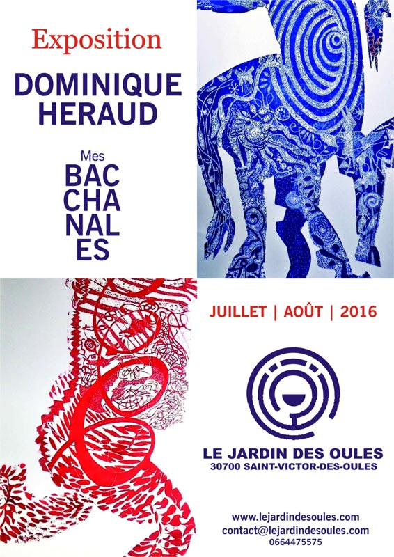 Durant l’été, en juillet et août, le Jardin des Oules accueille Dominique Héraud, aquarelliste, peintre et graveur qui expose ses «gravures au vent», ses Bacchanales. Dominique Héraud nous dit à propos de ses gravures au vent : «...