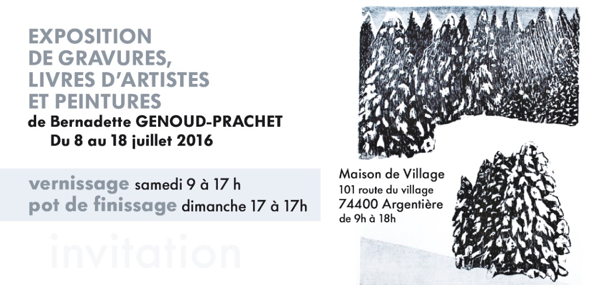 Bernadette Genoud-Prachet expose des gravures, livres d'artiste et peintures à la Maison du Village d'Argentiere (Vallée de Chamonix) du 8 au 18 juillet 2016.