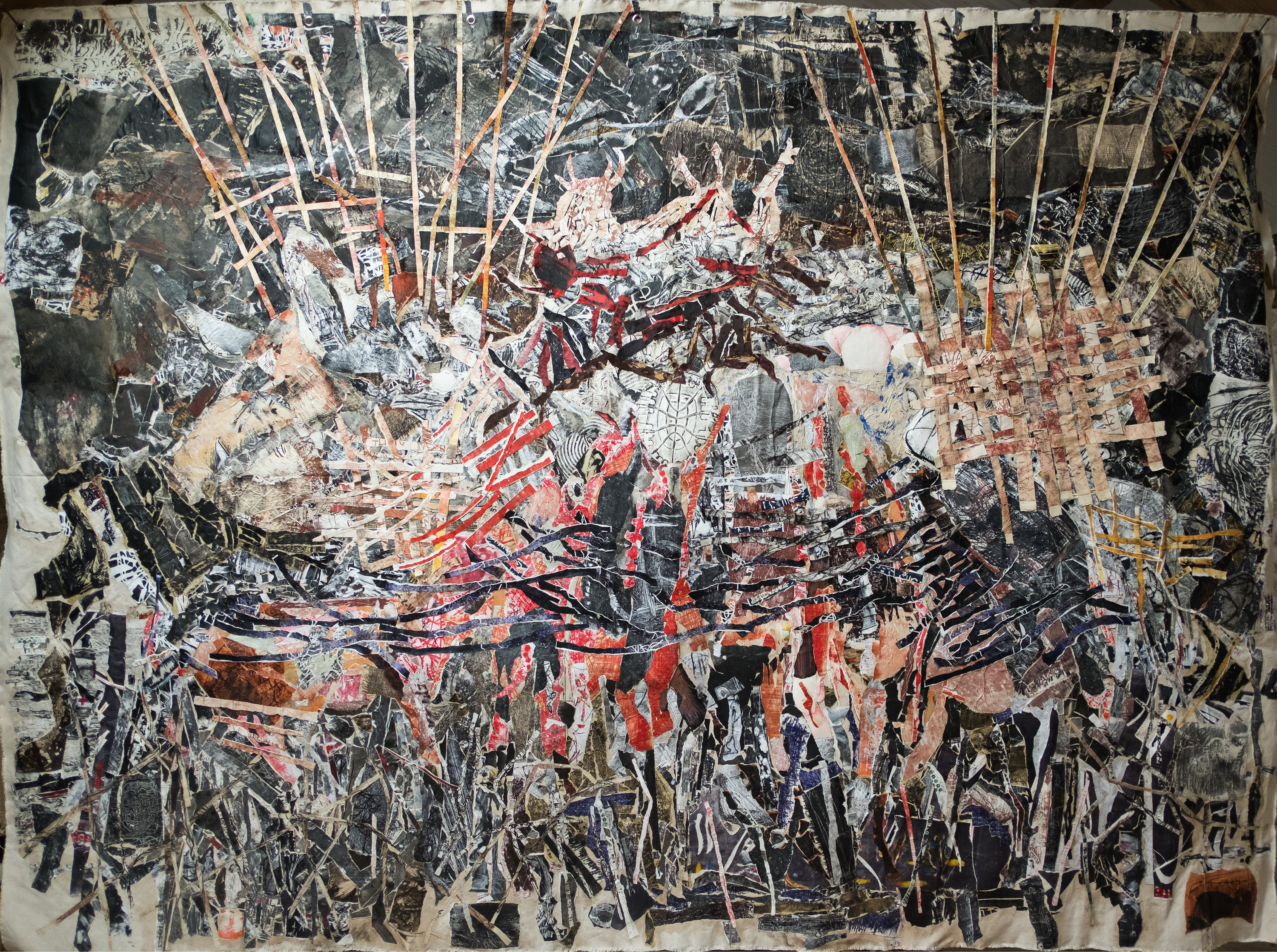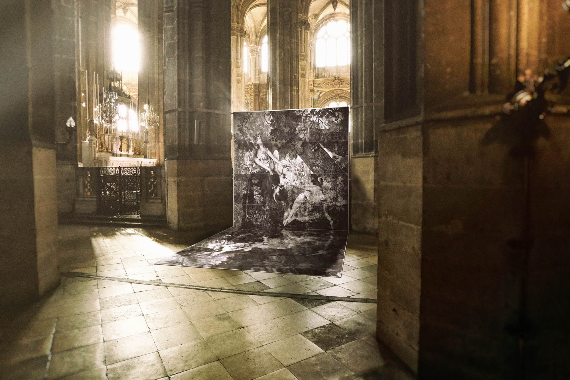 L'estampe "Le Paradis en morceaux" (de 3m x 3m) est installée dans la travée nord de l'église Saint-Eustache à Paris. Exposants Sylvie Abélanet