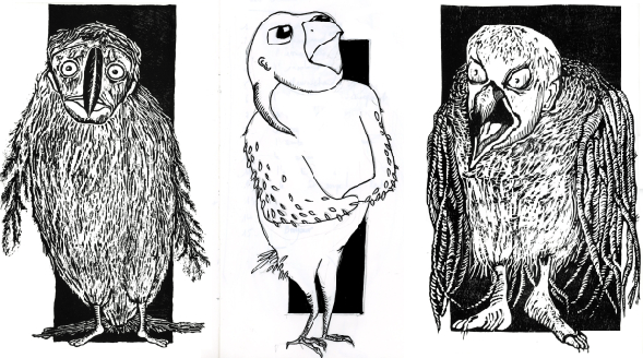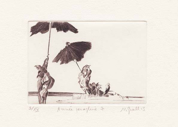 Exposition de gravures sur bois, notamment de la série en cours de réalisation d'oiseaux humanoïdes. Elles seront accompagnées par d'autres séries liées à la littérature (la mythologie grecque, la poésie de Michaux, de Verlaine...