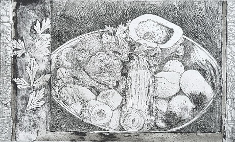 Gravures et peintures de Maxime Préaud : variations et fantaisies autour du thème du pot-au-feu. Extrait du poème d'accompagnement du port-folio édité par Maxime Préaud pour cette exposition : "...Si le clairet parfois pousse à la...