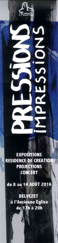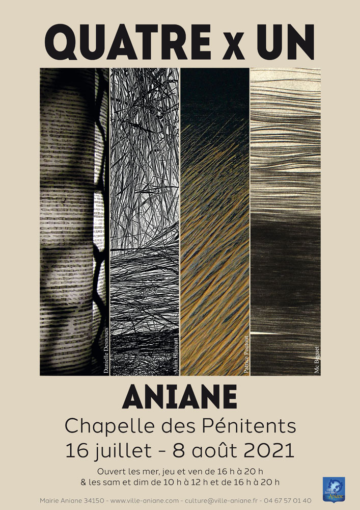Installation / exposition de gravures à la chapelle des pénitents au centre ville d'Aniane, proche de Montpellier (A 75 dir Millau, sortie Gignac puis Aniane) du 16 juillet au 8 août. Exposants D. Desnoues, P. Poutout, A. Blancard, MC Beguet ...