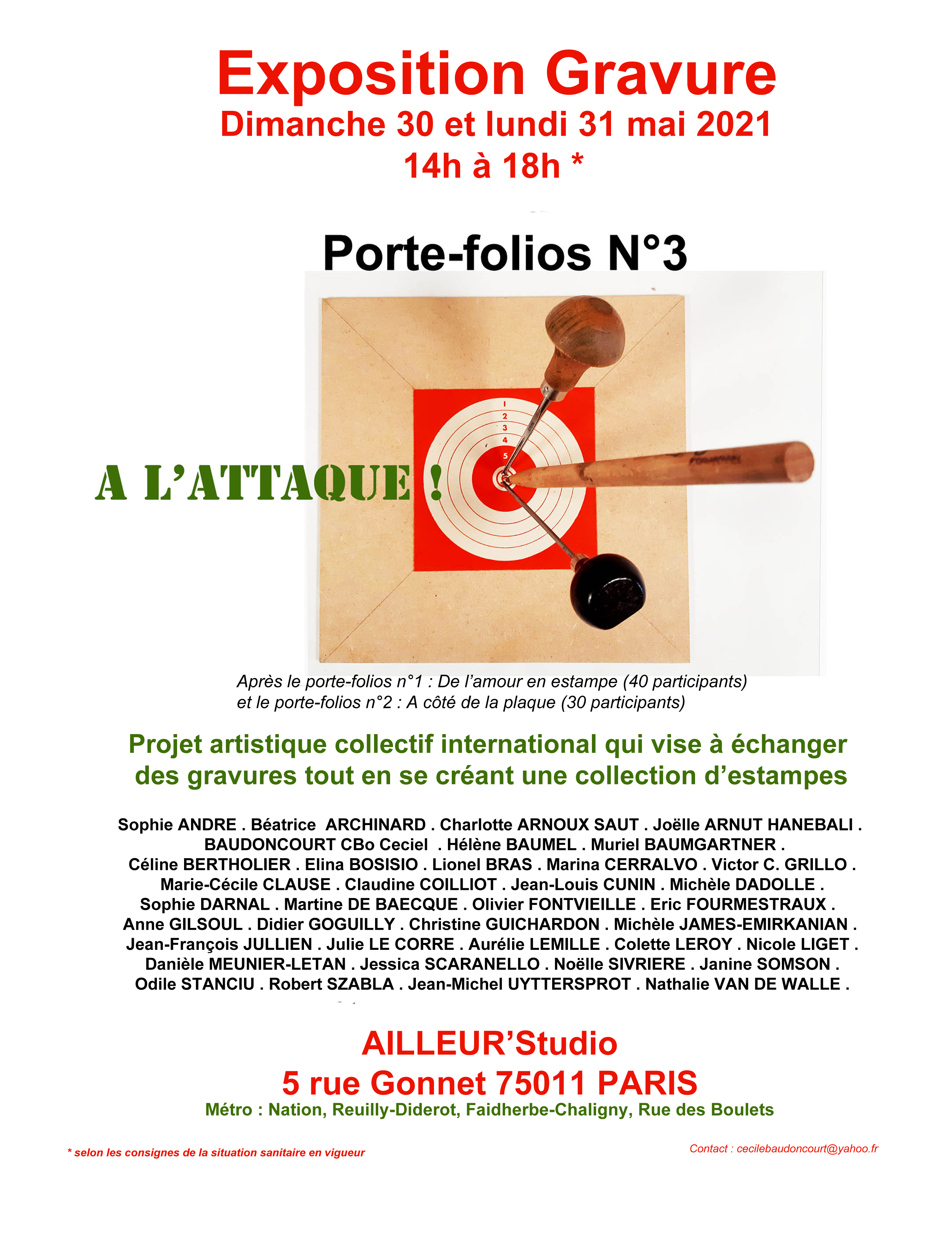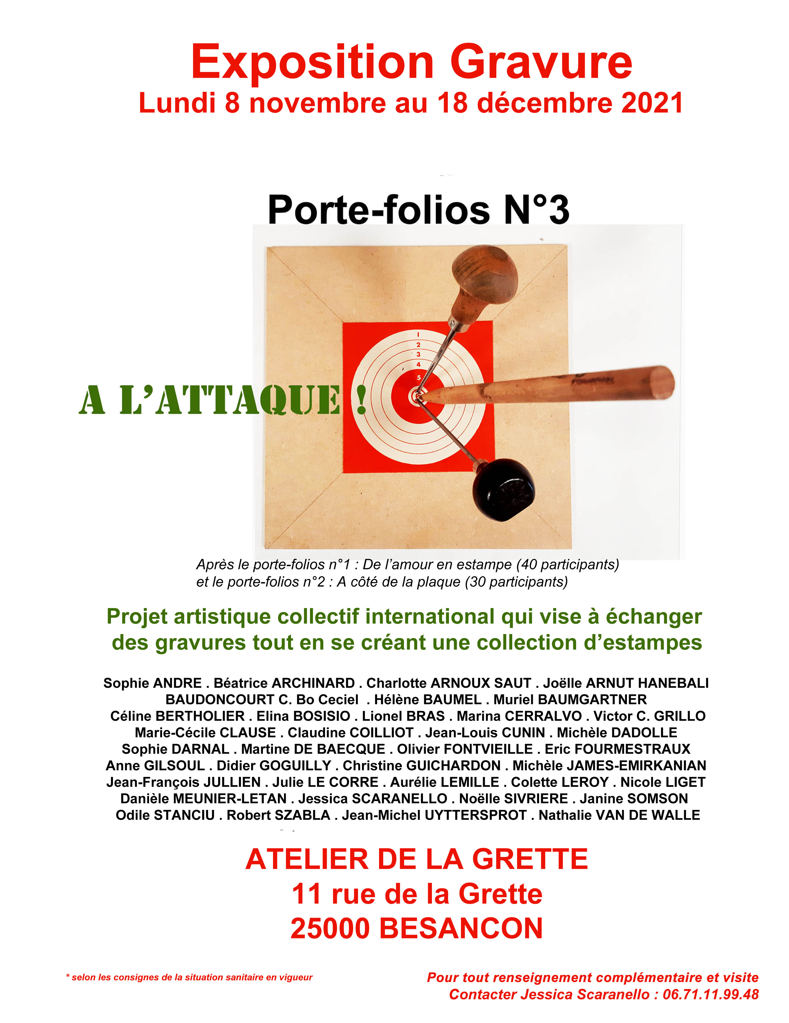Exposition de gravures du porte folios n°3 "A L'ATTAQUE!", projet artistique international d'échange de gravures, proposé par Cécile Baudoncourt Exposants Sophie ANDRE . Béatrice ARCHINARD . Charlotte ARNOUX SAUT . Joëlle...