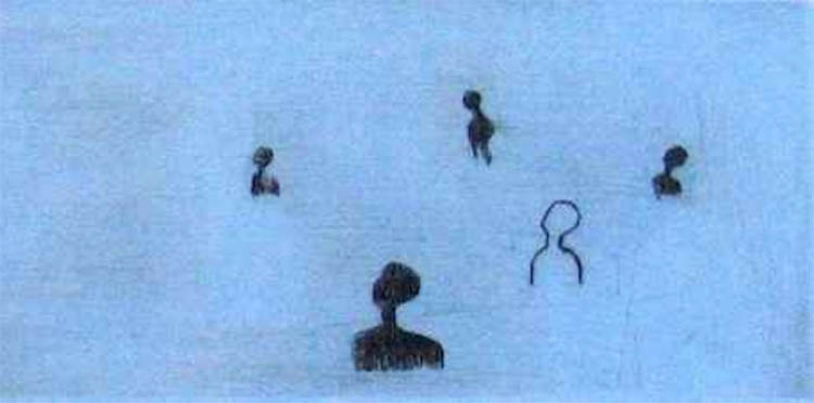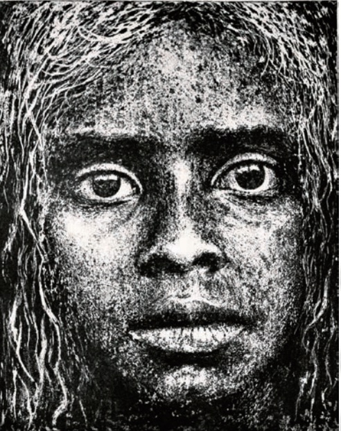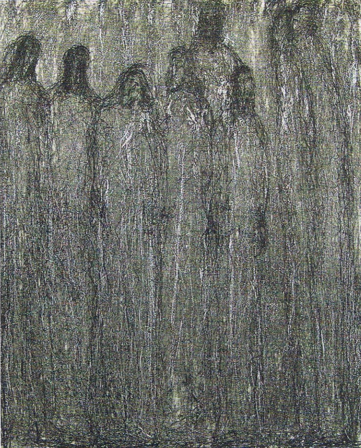Visage levant (...) "Ils se tiennent devant nous, sagement, en ordre d‘exposition. Sous un trait pur, percés de grands yeux, rongés par des cavités de couleurs contrastées, les visages font foule. Voici un petit groupe de femmes qui portent les airs de...