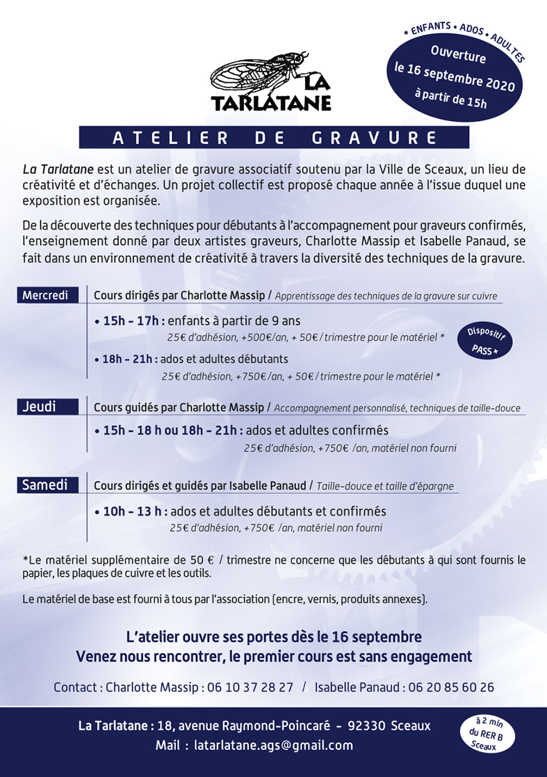 Rentrée 2020 : l’Atelier de gravure La Tarlatane fait peau neuve * niveaux de cours : enfants 9 ans et +, ados, adultes débutants ou confirmés - 3 étages réaménagés / respect des gestes barrières -nouvelle presse grand format ***Séances...