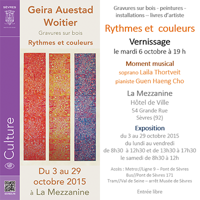 L'association Art contemporain Sèvres-collection Russo-Marie présente une rétrospective de 25 ans de gravures de Geira Auestad Woitier, artiste d'origine norvégienne, peintre-graveur et auteur de nombreux livres d’artiste, en compagnie d'une céramiste. Concert...