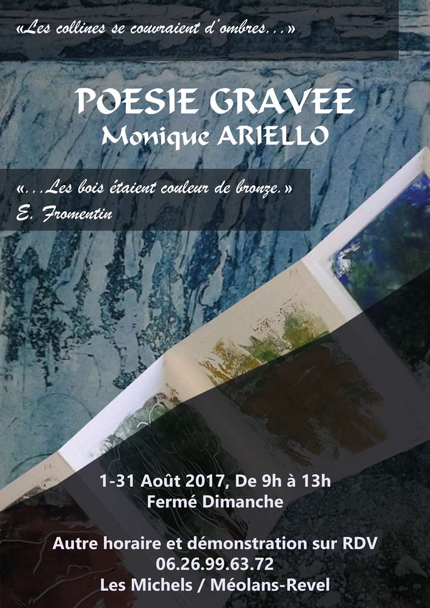Du 5 août au 3 septembre les murs de la Galerie du Bout du Monde à St. Hippolyte du Fort (Gard) accueillent le travail gravé d'Edith Schmid. Exposants Schmid Edith