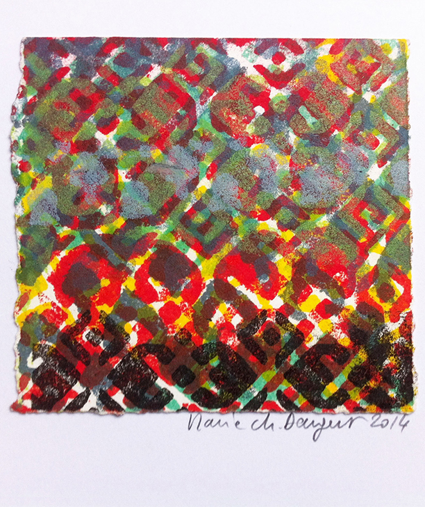 Christine Gendre-Bergère, ces derniers temps, explore avec discrétion les abords de son intimité : ce peut être la famille (Filiations, 2010, livre gravé avec pop’up), la calme rue voisine (Urbanités, 2011, livre gravé dans lequel, îlotière...