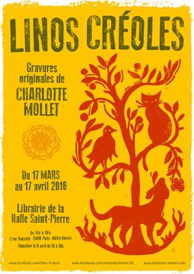 Une sélection d'une quinzaine de linos extraits du recueil de contes créoles edité chez Flies sont présentées à la librairie de la Halle St Pierre. Exposants Charlotte Mollet