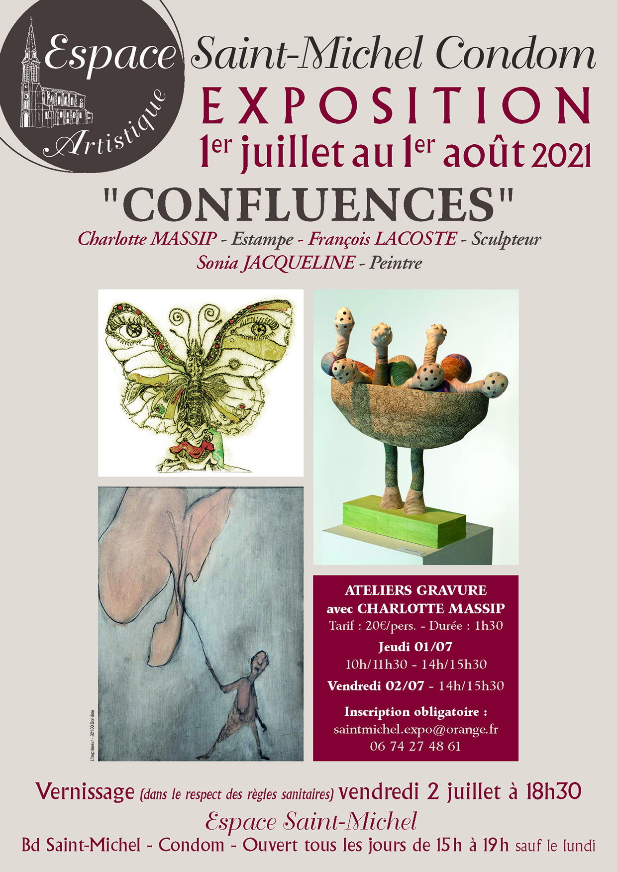 Sonia Jacqueline (peintre) - François Lacoste (sculpteur) - Charlotte Massip (graveur) Site: https://shop.charlottemassip.com/ Ateliers "découverte de la gravure" proposés par Charlotte à L’Espace Saint Michel - Condom (Inscription obligatoire...