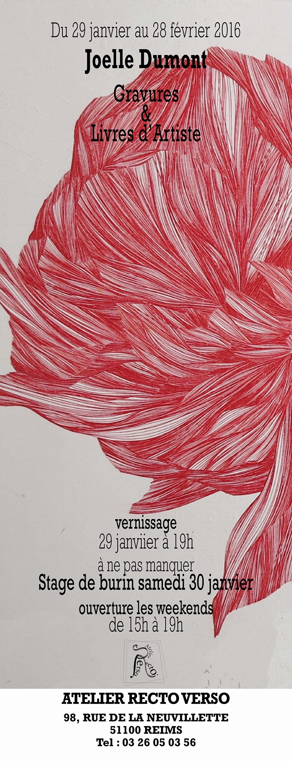 L'atelier Recto-Verso présente une exposition de gravures et de livres d'artiste de Joëlle Dumont. Un stage de burin avec l'artiste est prévu le samedi 30 janvier 2016 de 10h à 13h puis de 14h30 à 17h30. Renseignements et...