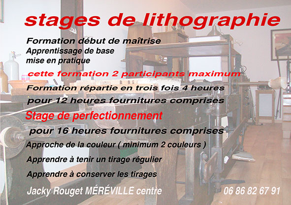 stage de lithographie apprentissage de base formation répartie en trois fois 4 heure perfectionnement pour 16 heures approche 2 couleurs (minimum) Exposants Jacky Rouget
